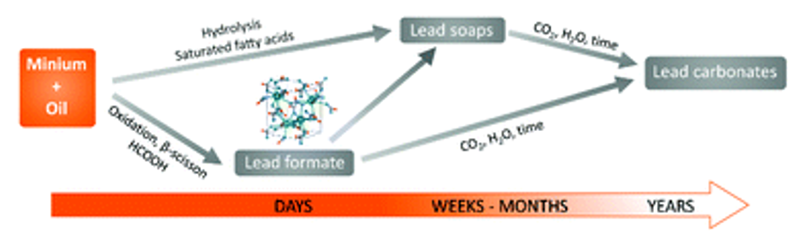 V rámci dlouhodobé spolupráce mezi ústavy makromolekulární (ÚMCh) a anorganické chemie (ÚACh) AVČR zabývající se popisem vzniku a následnou tvorbou agregátů, výčnělků, výkvětů či změn barev v historických olejových malbách, byla provedena návazná studie zaměřena na objasnění struktur způsobujících vznik těchto nežádoucích efektů. V předchozím výzkumu (10.1039/C9DT02040C) bylo zjištěno, že olovnaté karboxyláty (mýdla) vykazují rizikové chování, pokud vznikají v olejových malbách jako produkty degradace pigmentů. Vznik zmíněných olovnatých karboxylátů v historických malbách způsobuje vážné zhoršení kvality obrazů. V konečném důsledku muže být díky těmto procesům výrazně ovlivněno uchovávání, bezpečné vystavování, čištění a restaurování cenných maleb. Přestože se procesy vedoucí k tvorbě agregátů, výčnělků apod., které nepříznivě ovlivňují vzhled obrazů, považují za dlouhodobé, vznikající olovnaté karboxyláty jsou již detekovatelné v rané fázi vysychání olejových barev. Pro odhalení chemických změn v olověných pigmentech během sušení olejových filmů, byly studovány modelové systémy obsahující minium (Pb3O4) a čtyři druhy tzv. zasychajících olejů. Strukturní změny těchto systémů byly studovány pomocí kombinace rentgenové práškové difrakce (XRPD), 13C a 207Pb NMR spektroskopie v pevné fázi (ssNMR) a infračervené spektroskopie (FTIR). Společný výzkum jako první odhalil vznik krystalického mravenčanu olovnatého (Pb(HCOO)2) v dlouhodobém časovém horizontu a zároveň byl navržen degradační mechanismus. Vznik kyseliny mravenčí v olejích byla prokázána plynovou chromatografií s hmotnostní spektrometrií (GC-MS). Experimenty s parami prokázaly náchylnost Pb3O4 k reakci s těkavou kyselinou mravenčí uvolňovanou během autooxidace olejů. Navíc, náhled do lokálního okolí atomů olova v nátěrovém filmu pomocí 207Pb WURST-CPMG NMR spektroskopie ukázal, že atomy Pb(II) přednostně reagují s lněným olejem za vzniku vysoce krystalického Pb(HCOO)2, zatímco Pb(IV) atomy zůstávají nedotčeny. Dosažené výsledky prokázaly koexistenci krystalického mravenčanu Pb(HCOO)2, vysoce mobilní amorfní fáze odpovídající volným karboxylovým kyselinám nebo vznikající olověné mýdlové fázi a zbytkového Pb3O4 v polymerní/ionomerní síti. Předpokládá se, že Pb(HCOO)2 je meziproduktem pro přeměnu Pb3O4 na olověná mýdla popř. uhličitany.