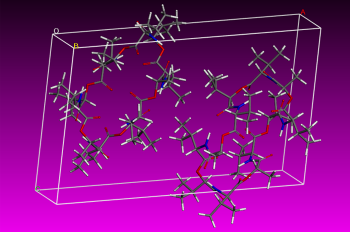 Předpokládáme, že měření spekter NMR pevného stavu může být důležité pro charakterizaci lékových forem valinomycinu, a proto jsme popsali spektrální parametry specifické pro jeho jednotlivé krystalové modifikace (na obrázku je základní buňka monoklinického krystalu valinomycinu).